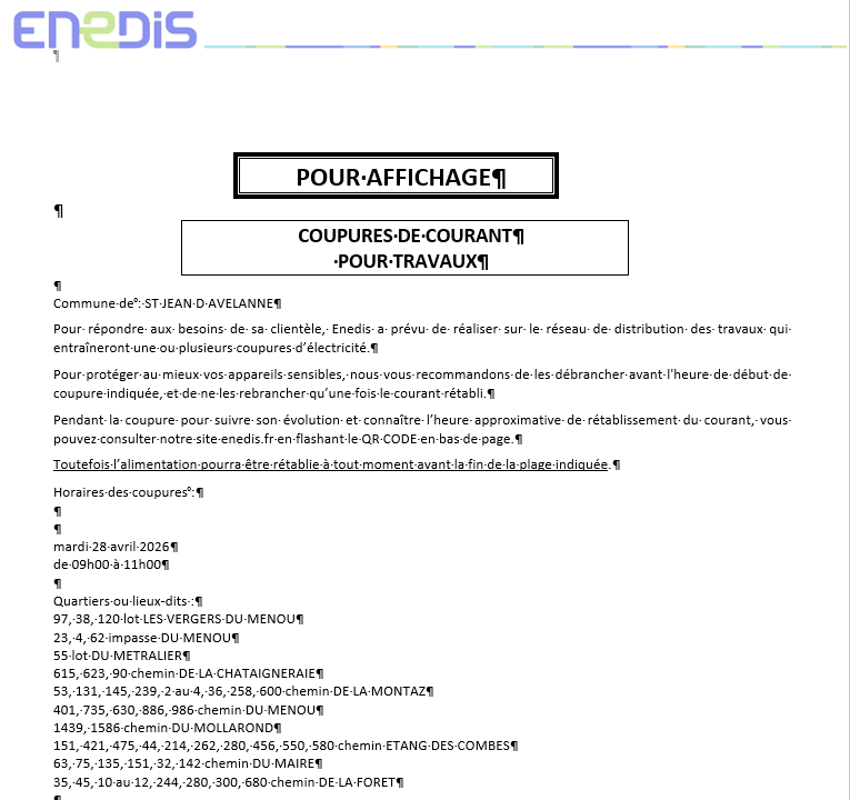Publié le 8 avril 2026 par MairieENEDIS : coupure électricité pour travaux le 28 avril 2026 de 9h00 à 12h00