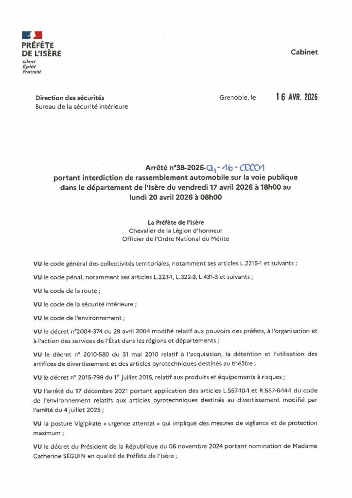Arrêté préfectoral portant sur l’interdiction de rassemblement automobile sur la voie publique dans le département de l’Isère du vendredi 17 avril 2026 à 18h00 au lundi 20 avril 2026 à 08h00.