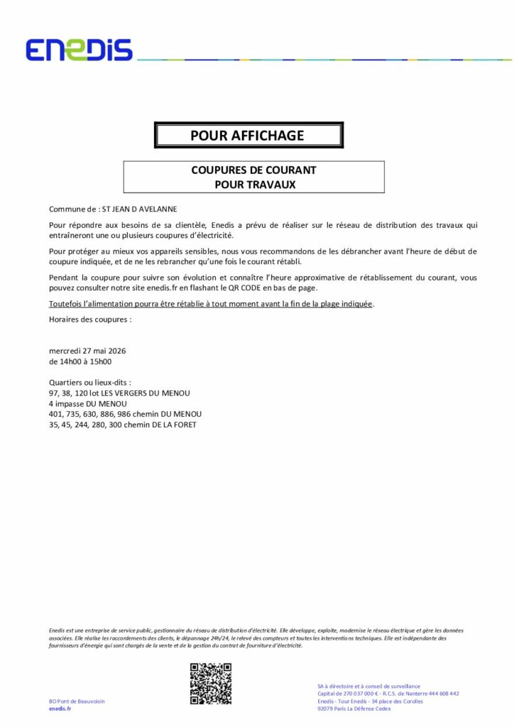 Mercredi 27 mai : ENEDIS prévoit une coupure d’électricité de 14h à 15h